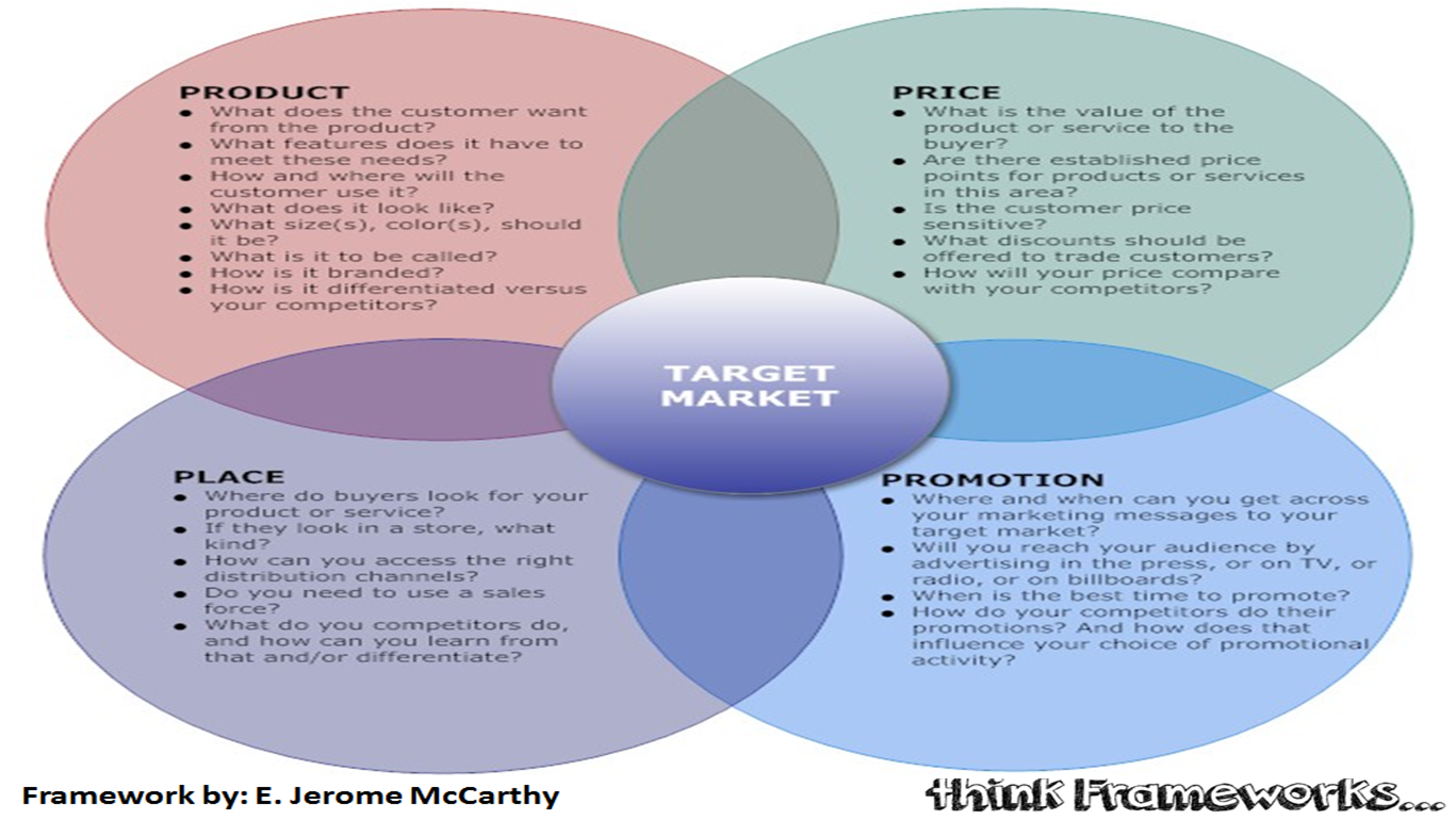 Изначально 4 этими элементами были продукт, цена, место и продвижение, которые позже были расширены за счет включения людей, упаковки и процесса. Теперь они считаются элементами маркетинг-микса 7P.