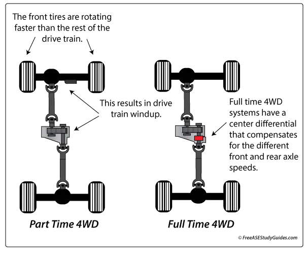 Полный рабочий день 4WD приводит в действие все четыре колеса, все время. Чтобы обойти упомянутую выше проблему перекручивания трансмиссии, в системе используется межосевой дифференциал (или просто дифференциал), который обеспечивает разную скорость для каждой оси.