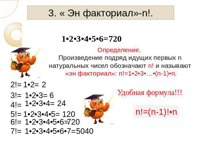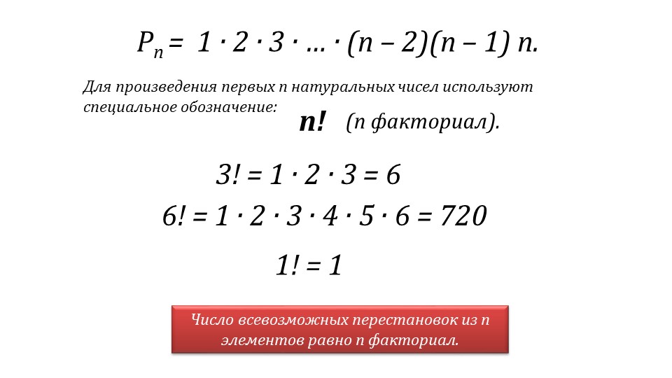 Пример: 6! = 6 x 5 x 4 x 3 x 2 x 1 = 720