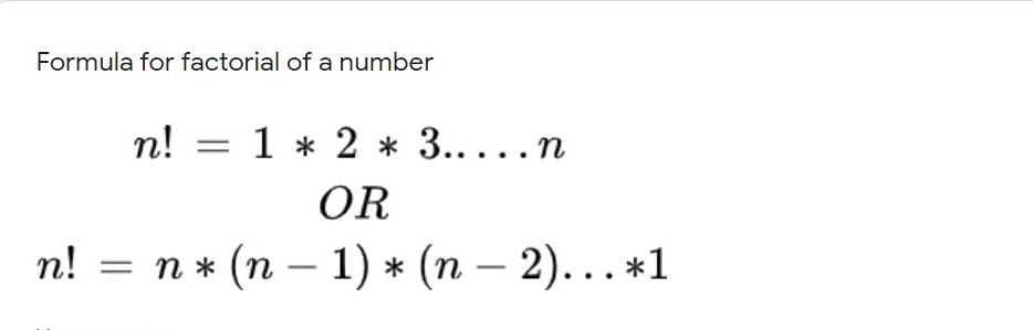 n! = n x (n — 1) x (n — 2) x (n — 3) … 3 x 2 x 1