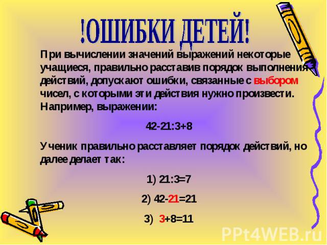 Π‘Π΅Π³ΠΎΠ΄Π½Ρ ΠΌΡ ΠΏΠΎΠ³ΠΎΠ²ΠΎΡΠΈΠΌ ΠΎ ΠΏΠΎΡΡΠ΄ΠΊΠ΅ Π²ΡΠΏΠΎΠ»Π½Π΅Π½ΠΈΡ ΠΌΠ°ΡΠ΅ΠΌΠ°ΡΠΈΡΠ΅ΡΠΊΠΈΡ Π΄Π΅ΠΉΡΡΠ²ΠΈΠΉ. ΠΠ°ΠΊΠΈΠ΅ Π΄Π΅ΠΉΡΡΠ²ΠΈΡ Π²ΡΠΏΠΎΠ»Π½ΡΡΡ ΠΏΠ΅ΡΠ²ΡΠΌΠΈ? Π‘Π»ΠΎΠΆΠ΅Π½ΠΈΠ΅ ΠΈ Π²ΡΡΠΈΡΠ°Π½ΠΈΠ΅, ΠΈΠ»ΠΈ ΡΠΌΠ½ΠΎΠΆΠ΅Π½ΠΈΠ΅ ΠΈ Π΄Π΅Π»Π΅Π½ΠΈΠ΅. Π‘ΡΡΠ°Π½Π½ΠΎ, Π½ΠΎ Ρ Π½Π°ΡΠΈΡ Π΄Π΅ΡΠ΅ΠΉ Π²ΠΎΠ·Π½ΠΈΠΊΠ°ΡΡ ΠΏΡΠΎΠ±Π»Π΅ΠΌΡ Ρ ΡΠ΅ΡΠ΅Π½ΠΈΠ΅ΠΌ, ΠΊΠ°Π·Π°Π»ΠΎΡΡ Π±Ρ, ΡΠ»Π΅ΠΌΠ΅Π½ΡΠ°ΡΠ½ΡΡ Π²ΡΡΠ°ΠΆΠ΅Π½ΠΈΠΉ.