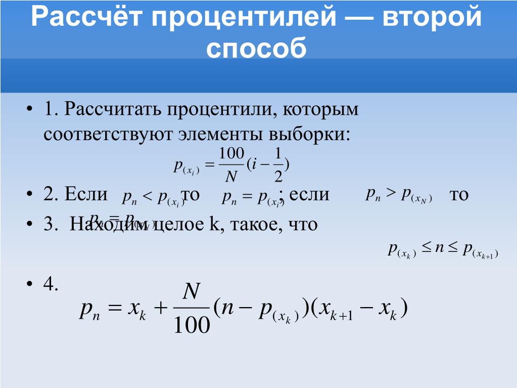 Дополнительно Что такое процентиль и как он рассчитывается? Процентиль рассчитывается по отношение количества значений ниже ‘x’ к общему количеству значений. Формула процентиля. Формула процентиля задается как Процентиль (P) = (Количество значений ниже u201cxu201d / Общее количество значений) × 100.