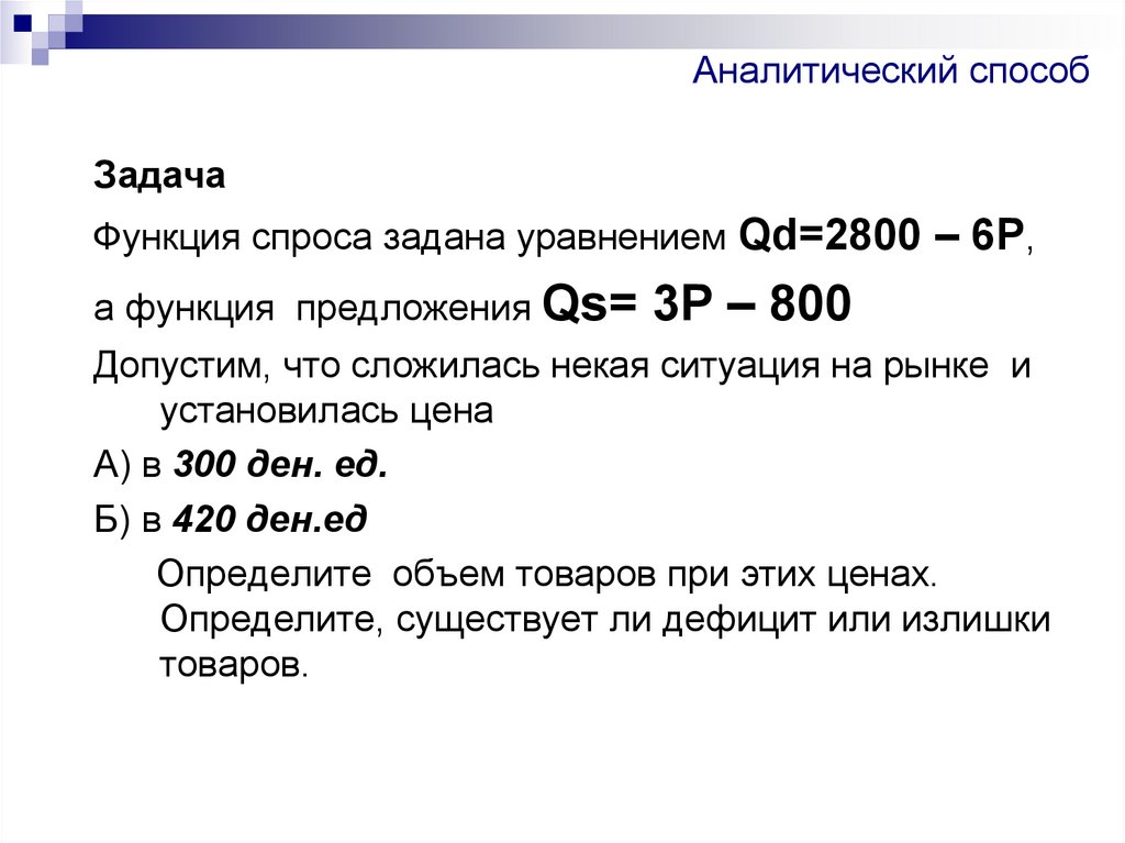 Постановка задачи: Объем спроса на товар Х определяется по формуле Qd = 2400 – 100 P, объем предложения – по формуле Qs = 1000 + 250 P.![]()