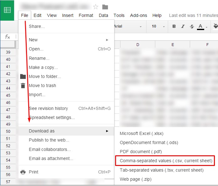 Если вы сохраните CSV-файл в другом формате, например XLS, XLSX или XLM, все данные будут отображаться в первом столбце. Вернитесь к исходному CSV-файлу и сохраните его в формате CSV.