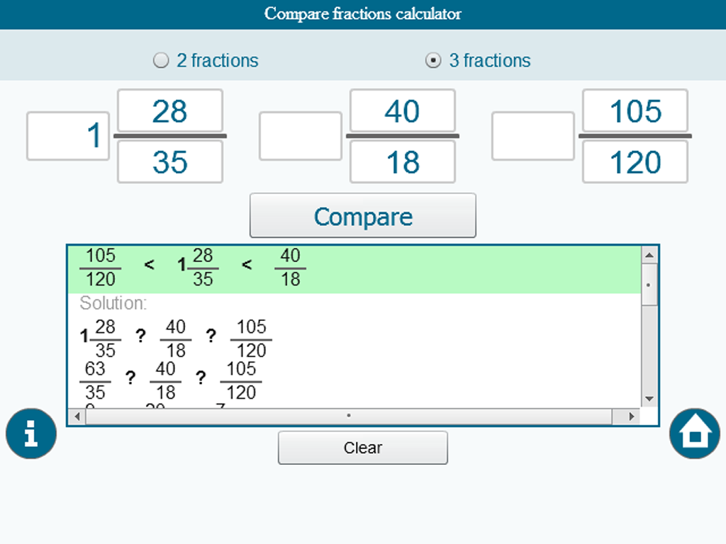 Он принимает правильные, неправильные, смешанные дроби и целые числа. Если они существуют, решения и ответы представлены в упрощенном виде,