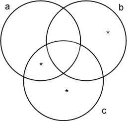 с тремя пропозициональными переменными a, b и c определяет диаграмма, изображенная на рисунке, где звездочки в ячейках соответствуют конъюнктивным составляющим этой совершенной нормальной дизъюнктивной формулы. Если отмеченных звездочками ячеек нет, то диаграмме Венна сопоставляется, напр., тождественно ложная формула, скажем (a&¬ a).