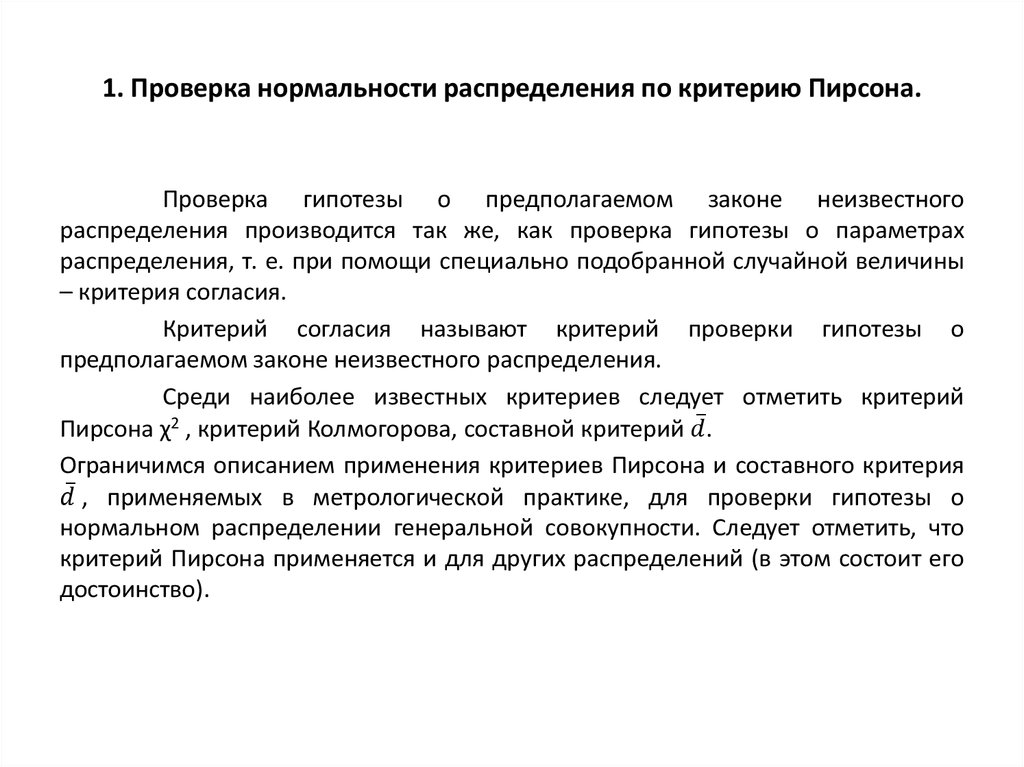 Пусть закон распределения случайной величины Х во всей генеральной совокупности неизвестен. Образована выборка объема n. По результатам выборки получено значение . Данные выборки позволяют сформулировать гипотезу Н0 о том, что случайная величина Х имеет нормальный закон распределения с параметрами . Для проверки этой гипотезы применяется критерий согласия Пирсона, статистика которого