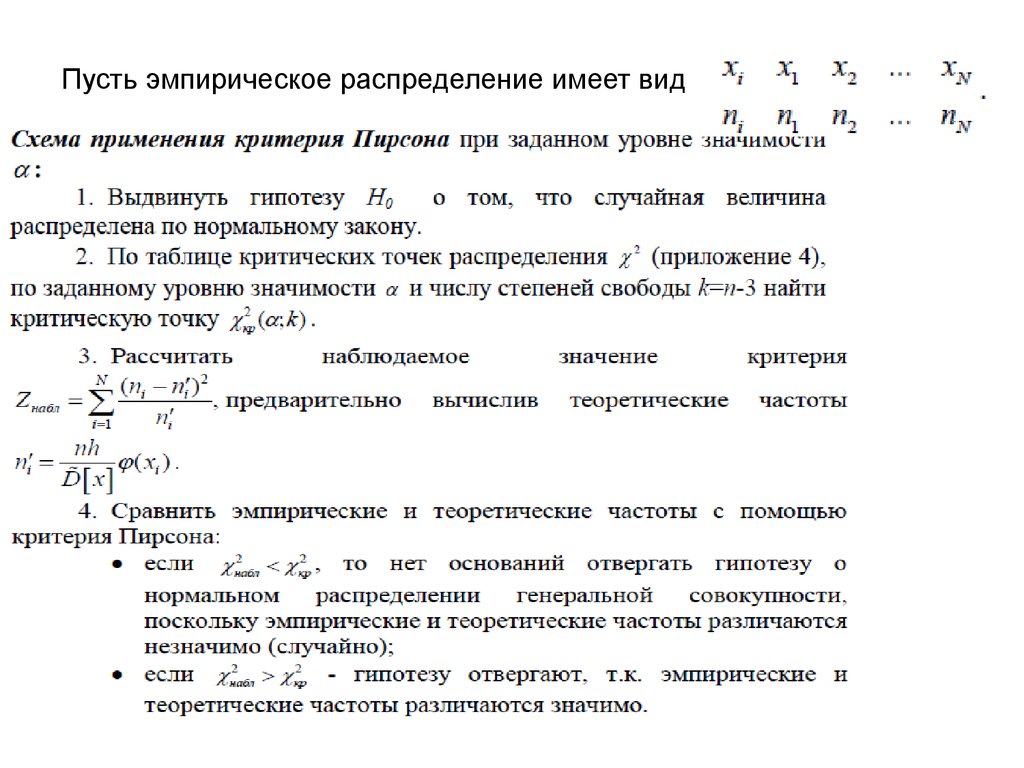 Формируется гипотеза Н0 о неизвестном законе распределения и по выборочным данным эта гипотеза либо отвергается либо принимается.