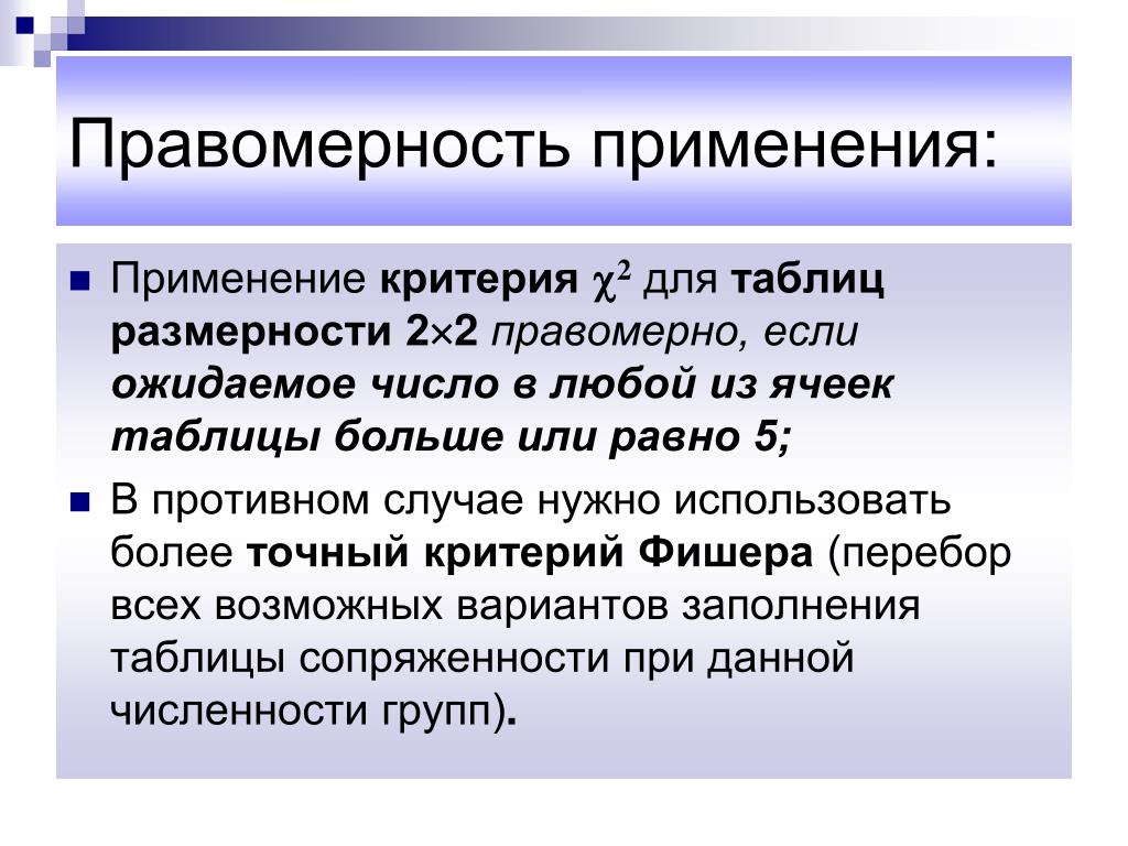 - Достаточно большой набор данных, чтобы в каждой из категорий наблюдаемых данных ожидалось не менее пяти значений.