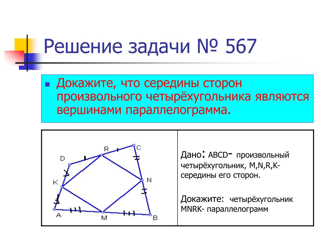Доказать, что середины сторон произвольного четырехугольника ABCD являются вершинами параллелограмма. [21]