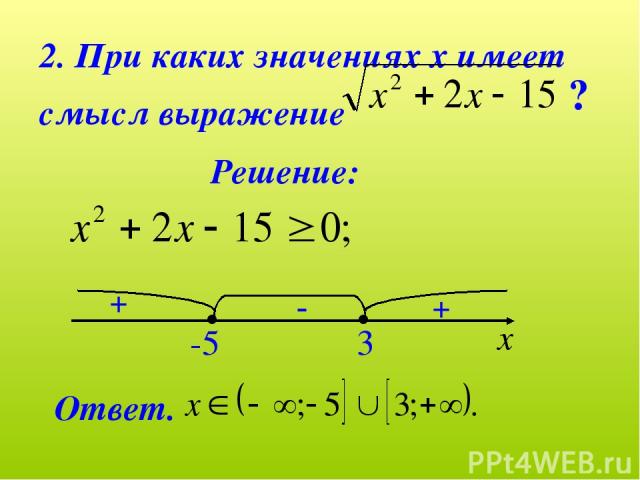 Пример 3 9{2}-2x-15}>0$Частное равно $0$, когда числитель равен $0$.