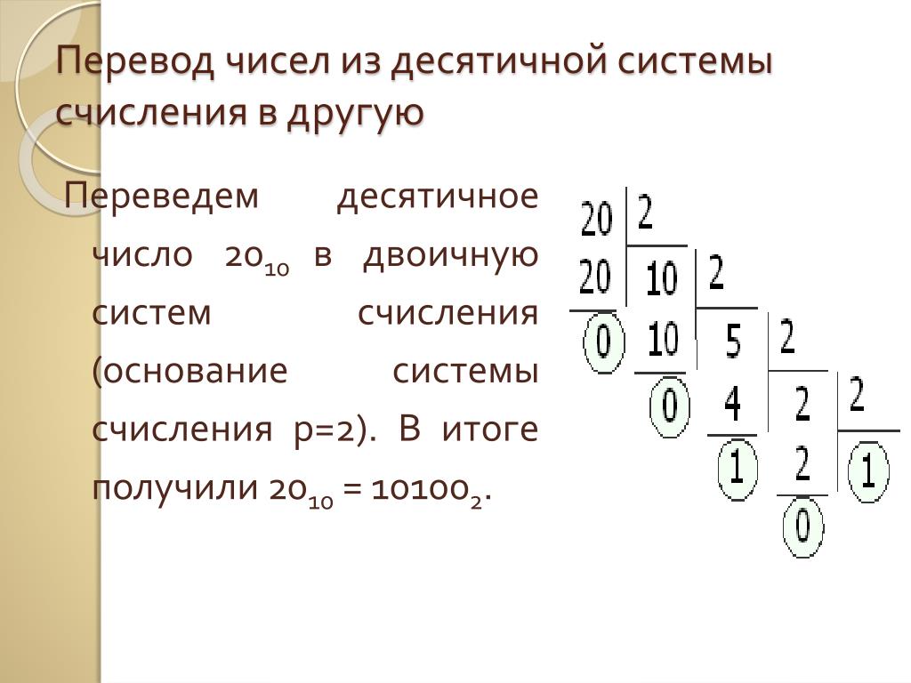Зная операции двоичной арифметики, можно переводить числа из двоичной системы счисления в любую другую.