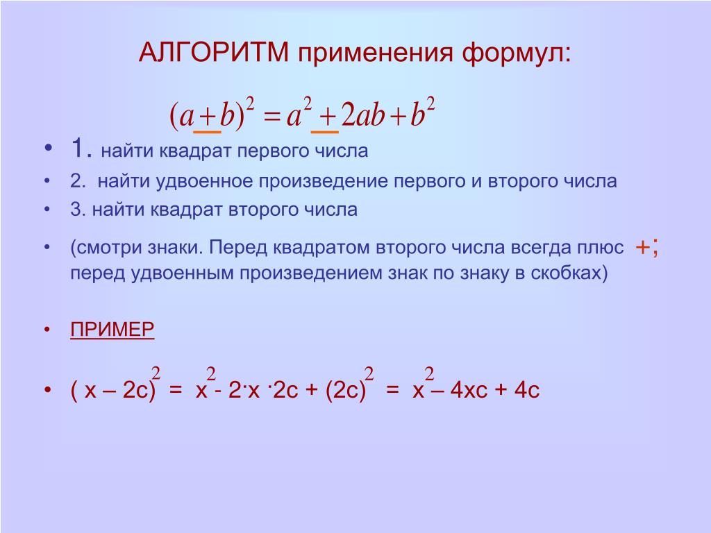 Для удобства восприятия ее можно записать так: (a − b − c)2 = a2 + b2 + c2 − 2ab − 2ac + 2bc.
