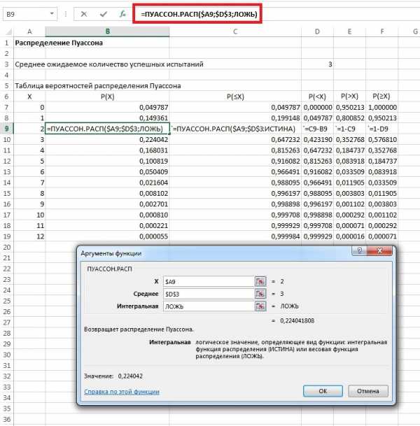 Сейчас вряд ли кто-то будет пользоваться таблицами, если под рукой есть Excel с его функцией =ПУАССОН.РАСП() (рис. 2). Эта функция имеет три параметра: число успешных испытаний Х, среднее ожидаемое количество успешных испытаний λ, параметр Интегральная, принимающий два значения: ЛОЖЬ – в этом случае вычисляется вероятность числа успешных испытаний Х (только Х), ИСТИНА – в этом случае вычисляется вероятность числа успешных испытаний от 0 до Х.