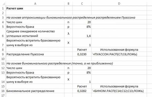 Предположим, что 8% шин, произведенных на некотором заводе, являются бракованными. Чтобы проиллюстрировать применение распределения Пуассона для аппроксимации биномиального распределения, вычислим вероятность обнаружить одну дефектную шину в выборке, состоящей из 20 шин. Применим формулу (2), получим