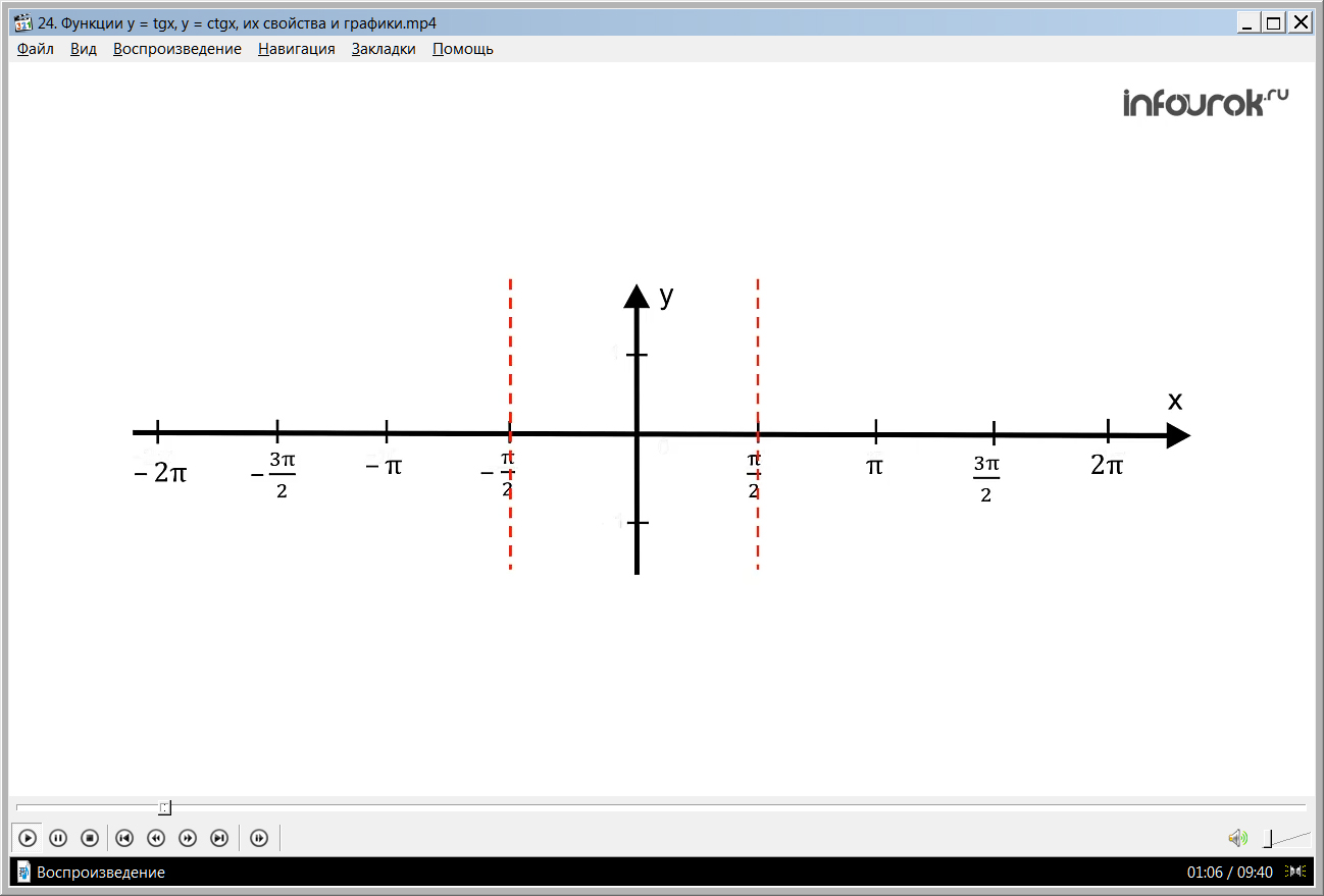 - Функция разрывается в точках \(x=\frac\pi2+\pi k\), которые пересечены вертикальными асимптотами. На отрезках между ними функция не прерывается, то есть \(\left(-\frac\pi2+\pi k;\ \frac\pi2+\pi k\right).\)