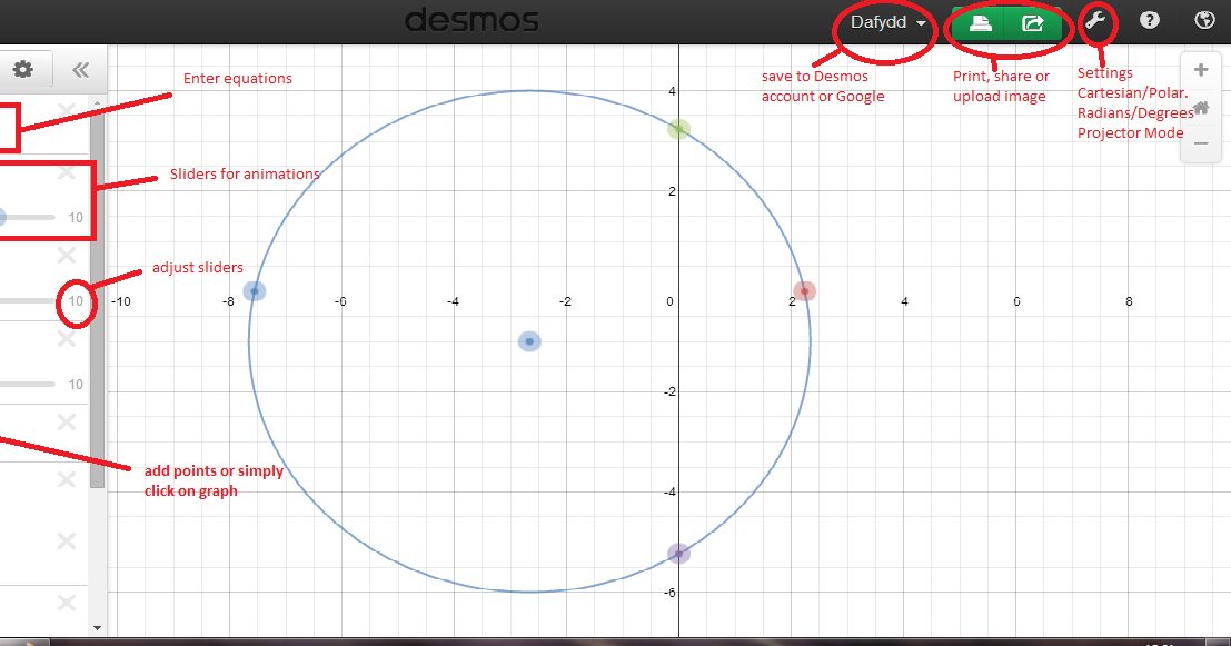 Когда ваш ученик будет готов к практическому изучению Desmos, откройте ссылку на график (или введите уравнение) в Desmos и попросите вашего ученика попрактиковаться в базовых командах Desmos, описанных выше.