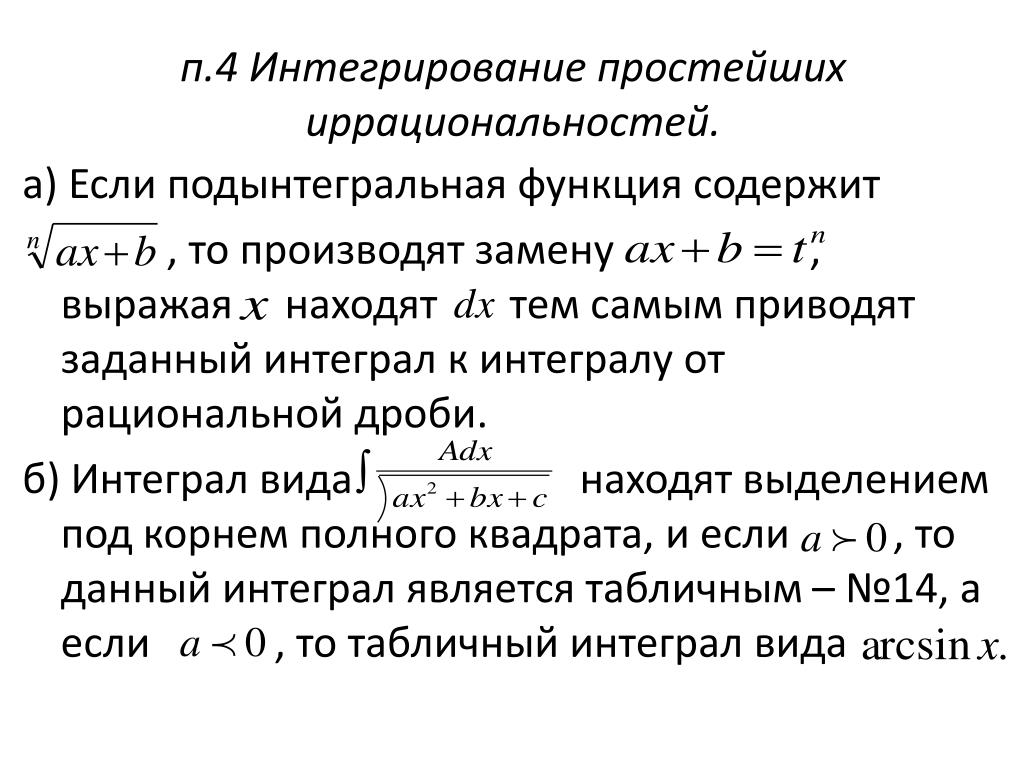 Некоторые виды интегралов, содержащих иррациональные выражения, можно свести к интегралам от рациональных функций путем соответствующей замены.