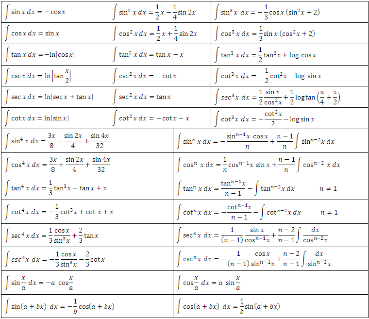 Список интегральных формул с участием тригонометрических и обратных тригонометрических функций приведен ниже,- ∫ cos x dx = sin x + C