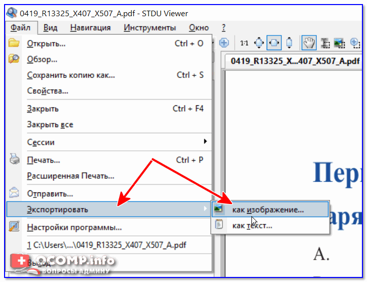 нажмите кнопку "Открыть" Теперь вы можете вносить изменения, чтобы применять различные правки. Чтобы преобразовать его в формат изображения, перейдите в меню «Файл» и выберите «Экспортировать как», , затем измените расширение на формат изображения по своему вкусу (jpg, png, gif) и нажмите «Экспорт».