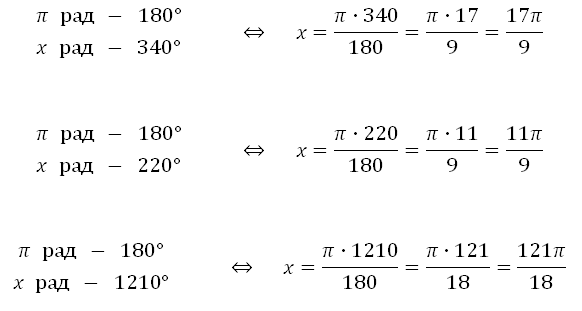 | Степени | Радианы (точно) | Радианы (приблизительно) |