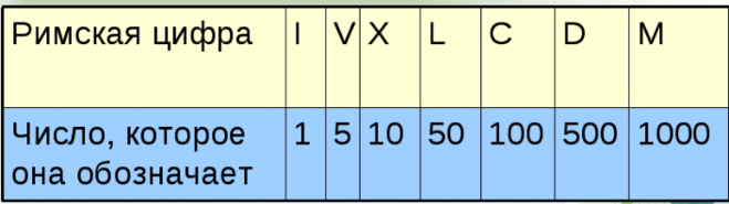 В римской системе счисления используется всего семь символов: I, V, X, L, C, D и M. I представляет число 1, V представляет число 5, X равно 10, L равно 50, C равно 100, D равно 500 и M равно 1,000.