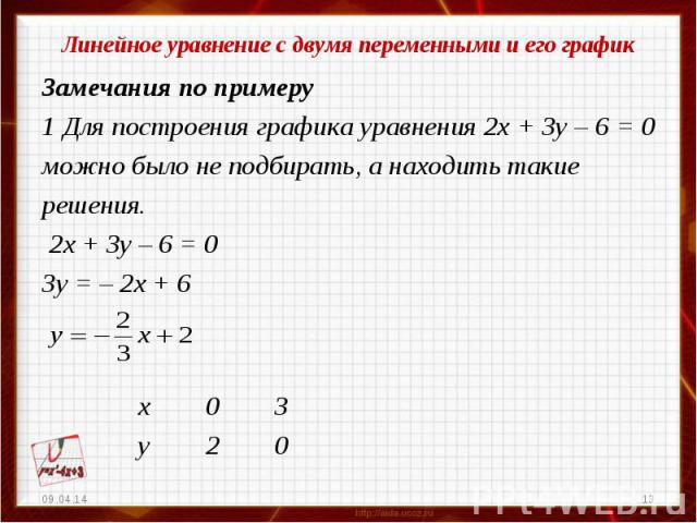 Линейные уравнения чаще всего встречаются в форме «\(y=\)», потому что это самый простой способ построить график на основе уравнения. Это называется формой пересечения наклона. Тем не менее, вполне допустимо иметь уравнение с переменной \(x\) или с переменными \(x\)– и \(y\) в левой части уравнения.