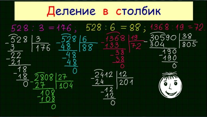 Практически любую арифметическую операцию возможно выполнить в столбик. Для каждой существуют определенные правила или методики. Деление осуществляется нацело и с остатком. Последнее применяется в различных языках программирования при конструировании условий.