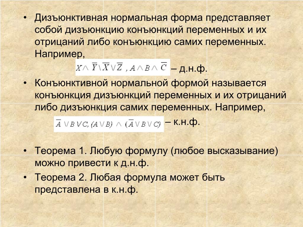 Дизъюнктивной нормальной формой называется формула, которая эквивалентна данной формуле и состоит из суммы элементарных произведений. Например: