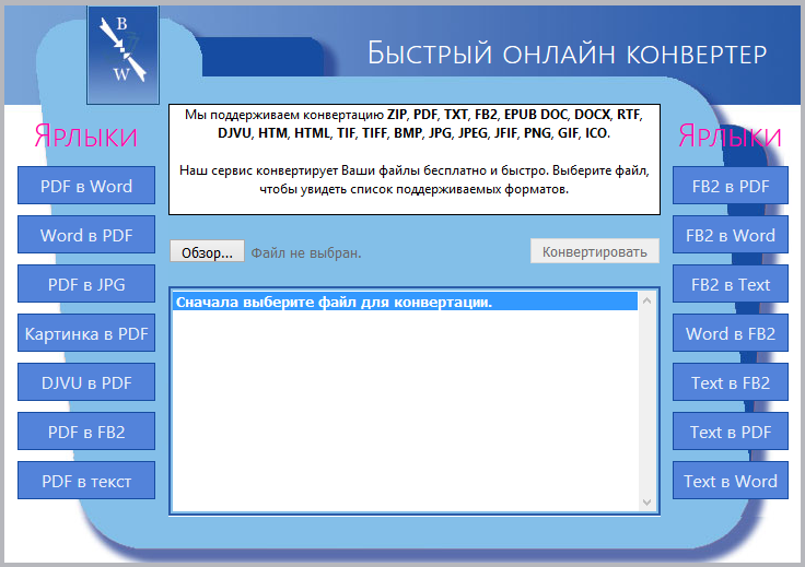 Convertio.co — бесплатный сервис для конвертации файлов различных форматов. Сервис работает на русском языке. Без регистрации доступна конвертация файлов размером не более 100 МБ.