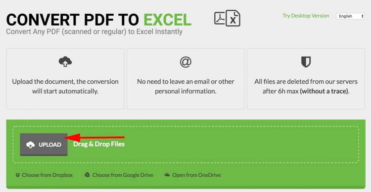 1 Перетащите файл PDF на наш онлайн-конвертер PDF в Excel .