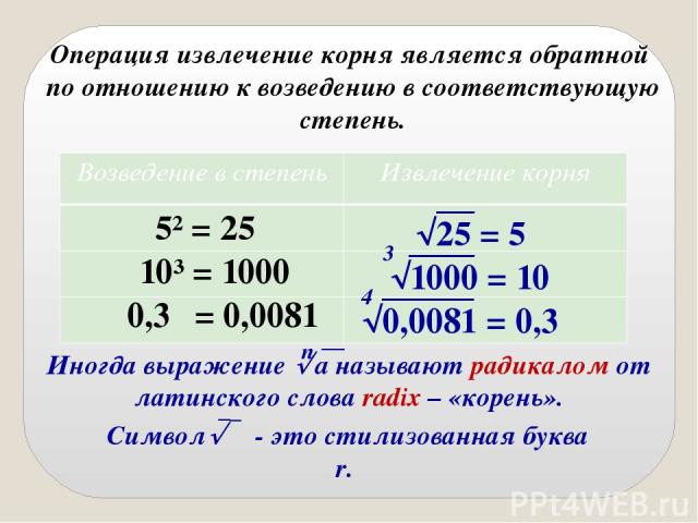 Итак, √ называется подкоренным символом, маленькая тройка над ним — индексом (что означает умножить на себя еще два раза), а число 1000 называется подкоренным.