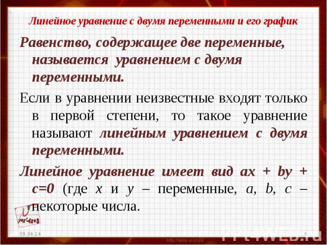Типы рабочих листов по линейным уравнениям для 8-го класса Объяснение: Онлайн-рабочие листы по линейным уравнениям для 8-го класса были созданы, чтобы помочь учащимся изучать линейные уравнения в понятной и логичной форме. Стандартный формат линейного уравнения состоит из двух переменных и некоторых констант. Таким образом, линейное уравнение относится к степени 1 и определяется как математическое утверждение со знаком «равно». Решения линейных уравнений не изменяются, если к обеим частям уравнения применяется одно и то же число, независимо от арифметических операций, таких как сложение, вычитание, умножение и деление.