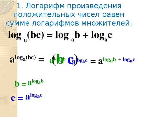 , откуда по определению логарифма вытекает доказываемое равенство.Покажем примеры использования свойства логарифма произведения: log 5 (2·3)=log 5 2+log 5 3 и .