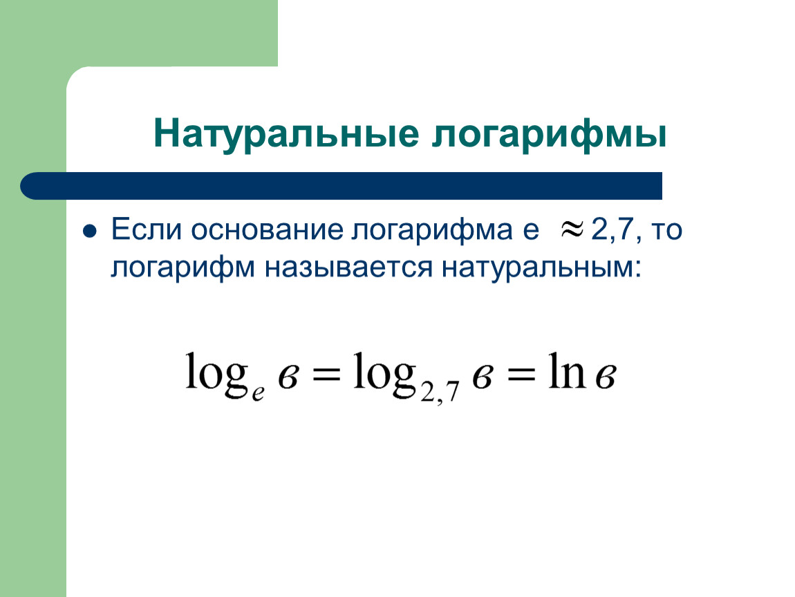 - Значение log e по основанию e, то есть значение ln e равно 1.