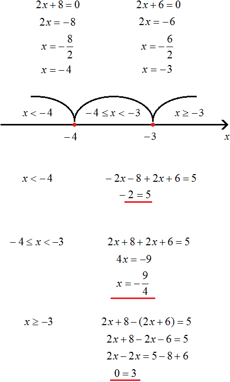 Такой вид уравнения удобнее решать методом интервалов (или более точно — методом промежутков). Суть этого метода в том, чтобы разбить координатную прямую на несколько промежутков, а затем решить уравнение на каждом из этих промежутков. Модули исходного уравнения на каждом промежутке будут раскрываться по разному.