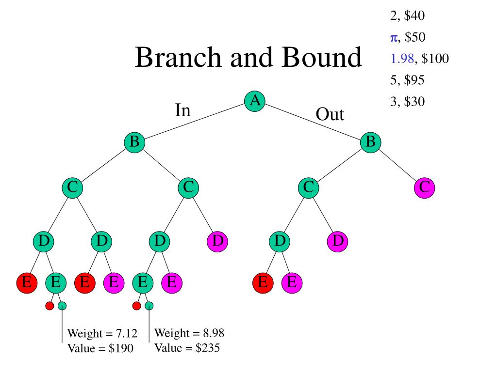 Если в задаче на максимум при решении подзадач получаются оптимальные целочисленные решения, то запоминаются те из них, которым соответствуют возрастающие значения ЦФ. Если полученное «непрерывное» решение подзадачи оказывается не лучше сохраненного целочисленного решения, то такая подзадача исключается из списка задач. Название этого метода объясняется тем, что в процессе решения задача последовательно «ветвится», разбиваясь на более простые подзадачи. Примечание: метод ветвей и границ используется также и в задаче коммивояжера.