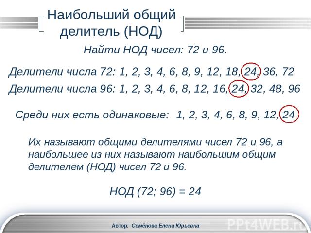 Пример : для чисел 12 и 18 наибольший общий делитель равен 6; он делится на все общие делители этих чисел: 1, 2, 3, 6.