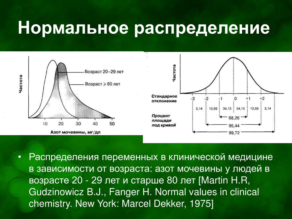 - В нормальном распределении среднее значение равно нулю, а стандартное отклонение равно 1. Оно имеет нулевую асимметрию и эксцесс 3.
