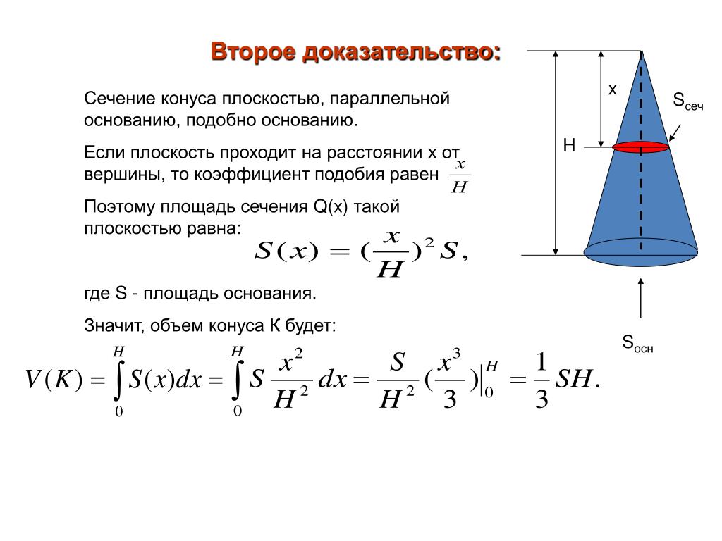 Теорема. Объем произвольного конуса равен одной трети произведения площади основания на высоту, т.е.