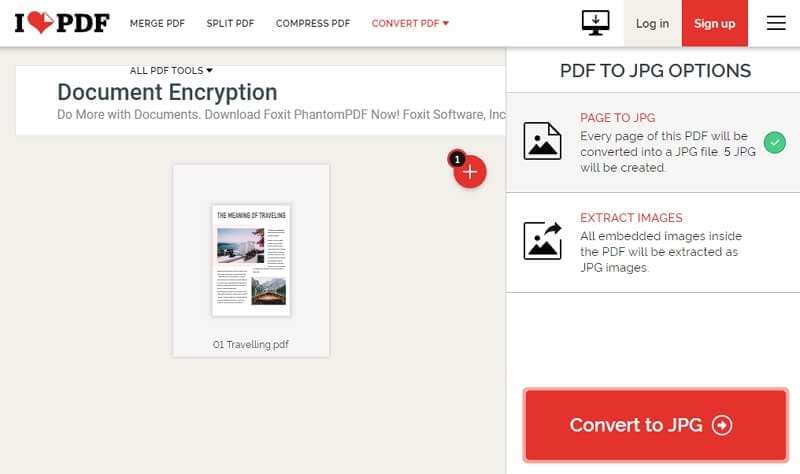 - Перейдите на веб-сайт ILovePDF и выберите PDF в JPG в разделе Преобразовать в .