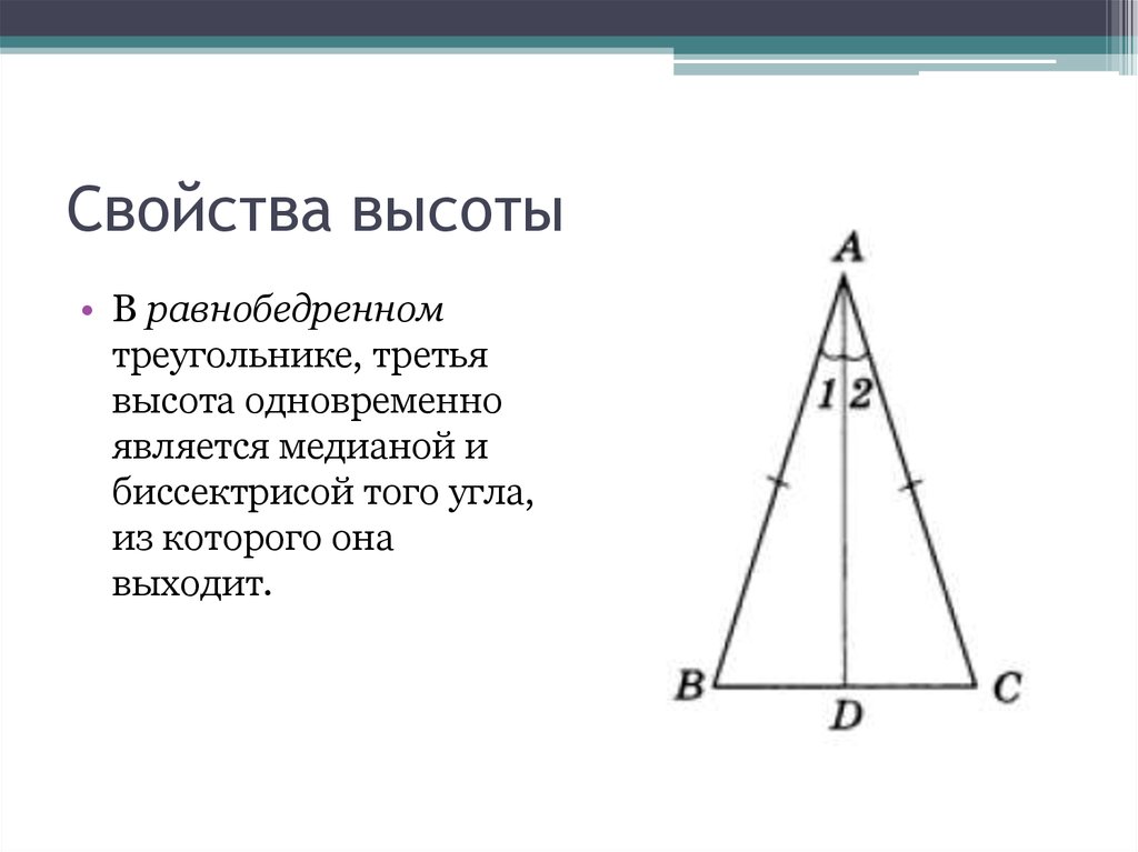 Высота, проведенная из вершины равнобедренного треугольника, делит основание на две равные части, а также делит угол при вершине на два равных угла.