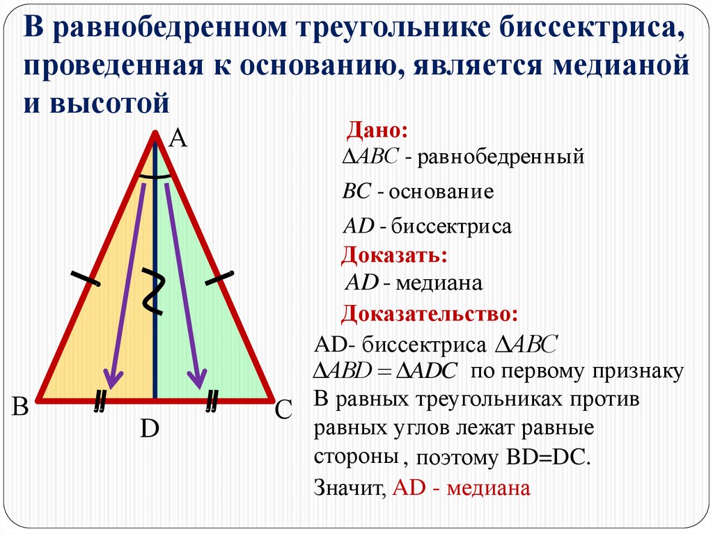 Каждая медиана делит равнобедренный треугольник на два равных треугольника, имеющих одинаковую площадь.