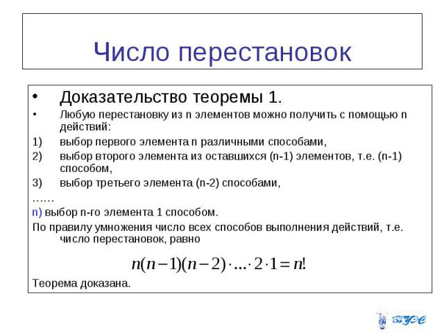 Доказательство. Для i1 имеем n возможностей. При выбранном i1 для i2 имеем (n-1) возможность. Таким образом, число различных перестановок равно !.