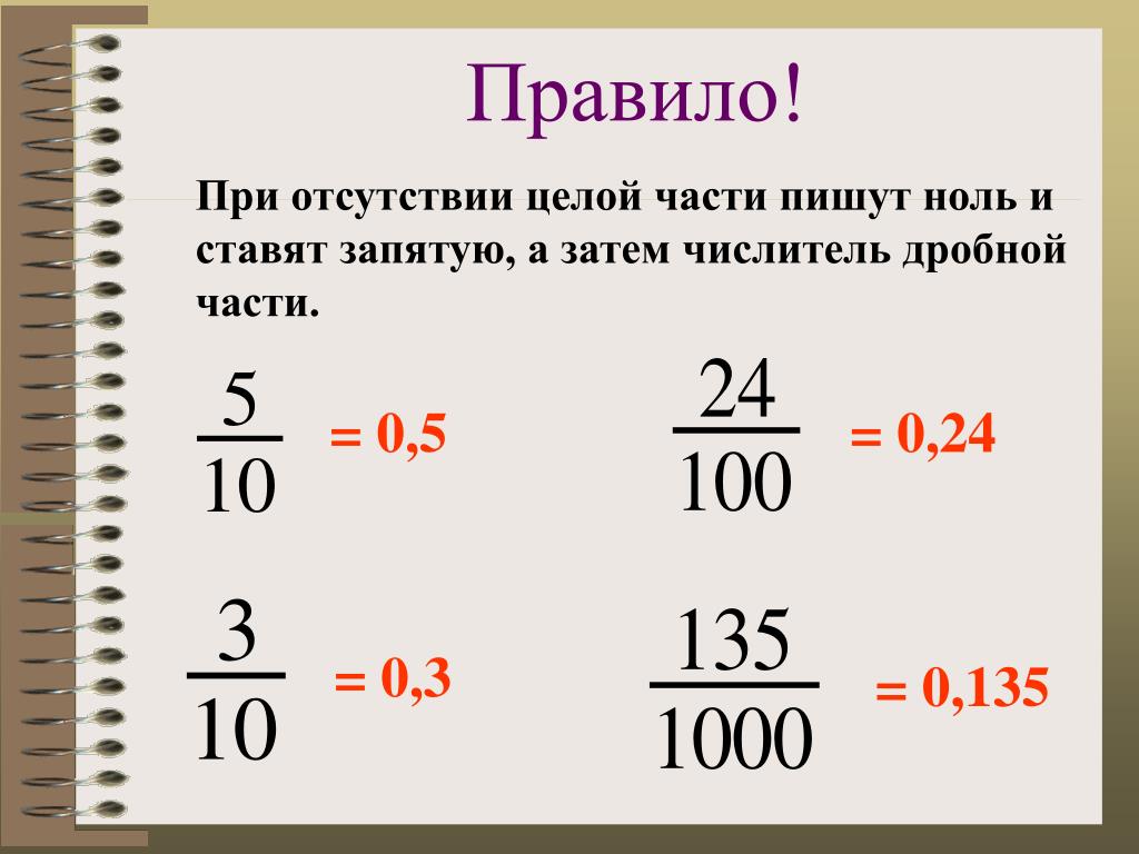 У нас есть дробь, к примеру, 0,5. Как уже выше писалось, она состоит из двух частей. Первое число 0, показывает, сколько целых единиц у дроби. В нашем случае их нет. Второе число показывает десятки. Дробь даже читается ноль целых пять десятых. Десятичное число перевести в дробь теперь не составит труда, пишем 5/10.