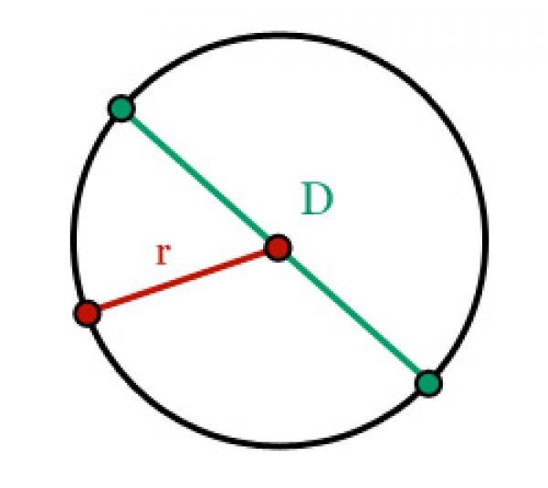 - Длину диаметра – отрезка, проходящего через центр круга и соединяющего две противоположные точки окружности, либо радиуса – отрезка, одна из крайних точек которого находится в центре круга, а вторая – на дуге окружности. Таким образом, диаметр равен длине радиуса, умноженной на два.