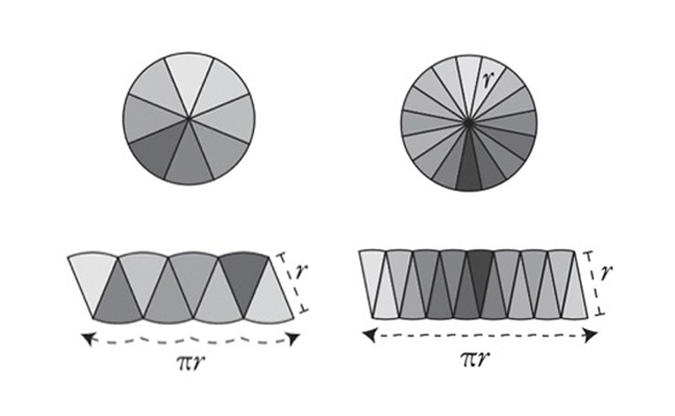 Этот удивительный проект «Сделай сам» показывает, что круг можно разрезать и переставить так, чтобы он напоминал параллелограмм с высотой r и основанием, равным pi, умноженному на r, путем разделения круга на части. Если вы сделаете больше срезов, аппроксимация, полученная таким образом, будет еще лучше. Кстати, есть еще один прекрасный способ понять математику площади круга! Вы можете проверить это здесь.