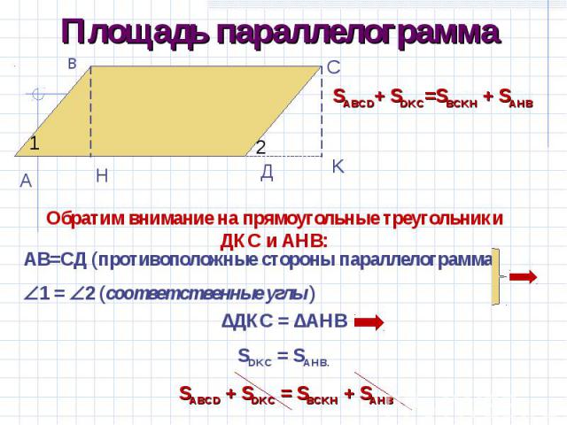 Рассмотрим параллелограмм . В нем – основание, и – высоты. Обратим внимание на прямоугольную трапецию , она состоит из двух фигур: параллелограмма и треугольника . С другой стороны, эта же трапеция разбивается на две другие фигуры: треугольник и прямоугольник . Исходя из этого, запишем третье свойство площади: