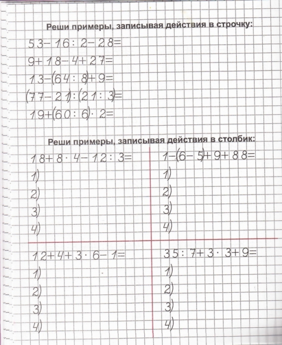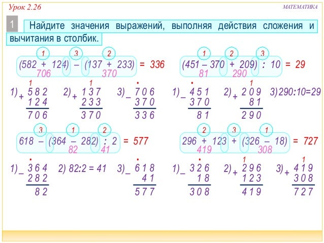 При нахождении значения выражения в первую очередь выполняются действия заключённые в скобки (если имеются), далее выполняются действия второй ступени и в последнюю очередь действия первой ступени.