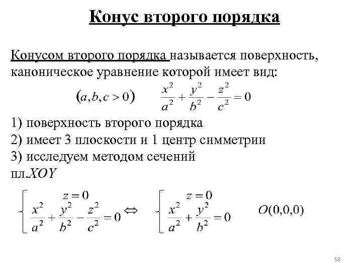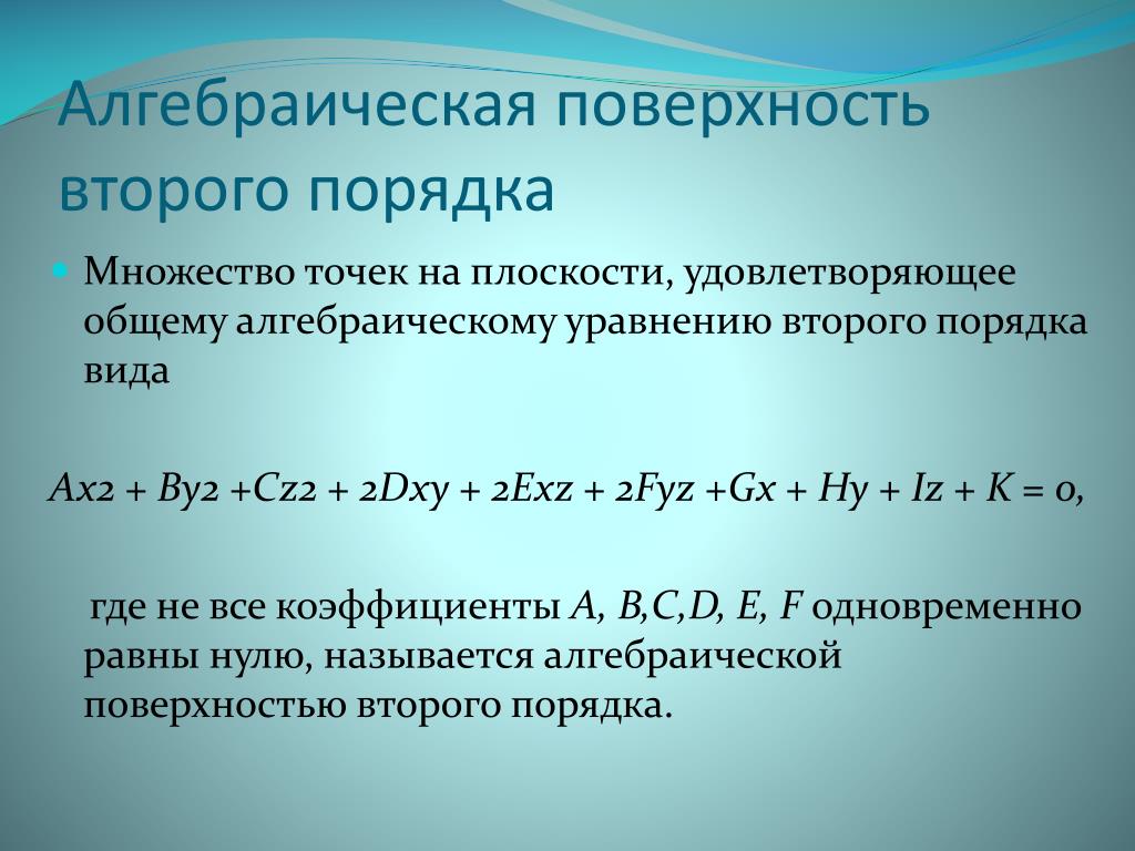 Алгебраическая поверхность второго порядка имеет уравнение вида: , где хотя бы один из коэффициентов членов второй степени отличен от нуля.